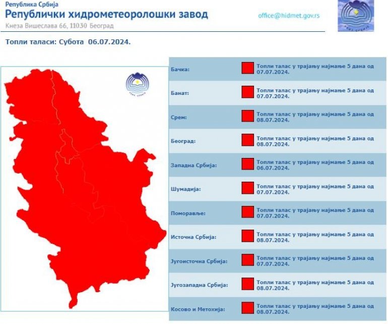- Upozorenje: Topli talas u trajanju od najmanje 5 uzastopnih dana. S obzirom na intezitet i vreme trajanja prognozira se veoma opasna vremenska pojava. Budite veoma obazrivi i pratite zvanična saopštenja o vremenu i prognozi vremena - stoji na sajtu RHMZ.