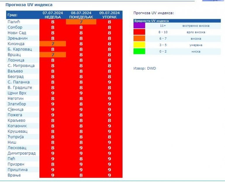 Kako se može videti na fotografiji, nivo UV indeksa je vrlo visok u velikom broju gradova, a u pojedinim je visok.