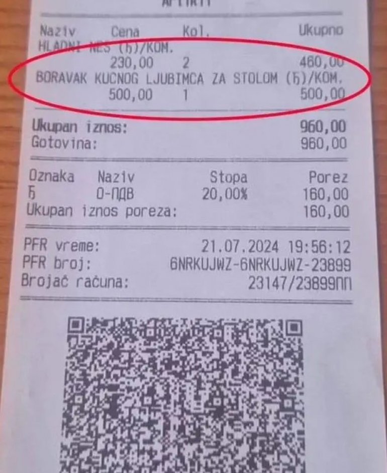 Korisnih društvene mreže Fejsbuk fotografisao je račun koji je dobio u Novoj Varoši u Srbiji gde mu je naplaćeno 500 dinara za boravak psa za stolom.