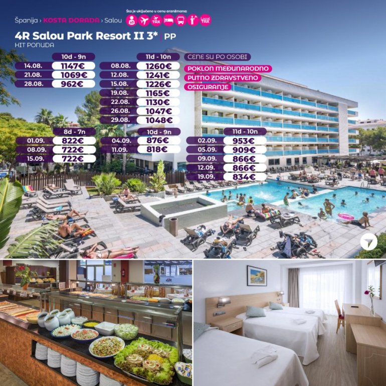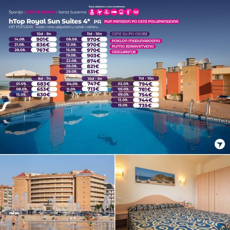 Sobe su moderne, a restoran služi kuhinju iz Španije i šire. Kompleks takođe ima dnevni zabavni program.