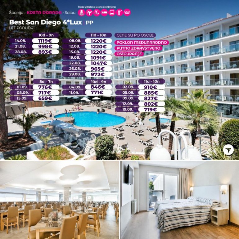 Hotel Best San Diego nalazi se na idealnoj lokaciji, na samo 200 metara od plaže Levante u gradu Salou. Objekat nudi bazen na otvorenom, hidromasažnu kadu i sobe sa balkonima. Plaža Kapelans, sa čitavim nizom sadržaja za sportove na vodi, udaljena je samo 5 minuta hoda od hotela. Centar grada Salou nalazi se na manje od 800 metara od smeštajnog objekta.