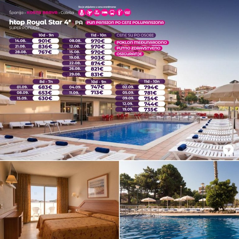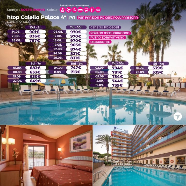 Hotel H Top Calella Palace nalazi se u regiji Kosta Brava u mestu Kalelja. Smešten je u blizini jedne od lepših peščanih plaža i starog grada. Plaža je udaljena 700 m od hotela. Duž cele obale prostire se pruga koja vodi do Barselone. Hotel takođe nudi otvoreni bazen, teretanu, bazen za decu, SPA centar, kids klub, mini vodeni park za decu kao i džakuzi koji se nalazi na poslednjem spratu hotela na velikoj terasi koja nudi veliki broj ležaljki za sunčanje.