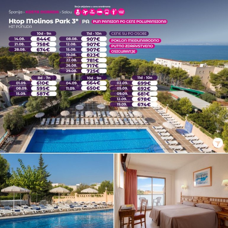 Hotel hTop Molinos Park se nalazi u mirnom delu mesta Salou. Udaljen je 10 minuta hoda od javne gradske plaze i od glavnog šetališta u centru grada. Hotel poseduje dve terase na krovu. Jedna terasa uključuje bazen za odrasle i bazen za decu sa ležaljkama i prostorom za sunčanje, dok druga terasa nudi džakuzi sa ležaljkama i prostorom za sunčanje.