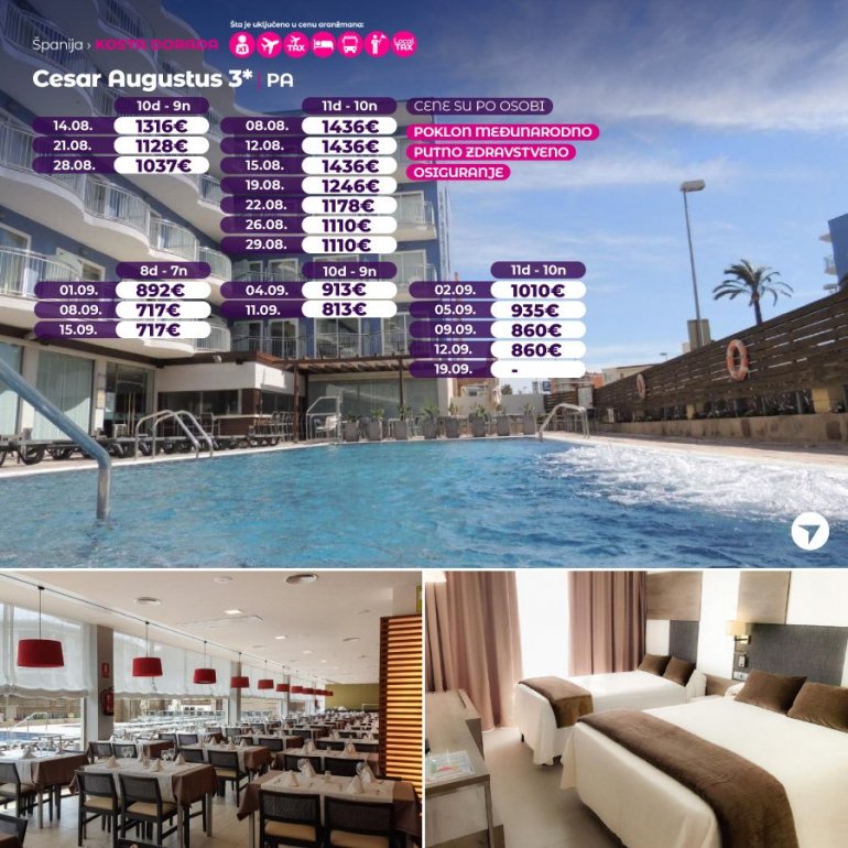 Hotel Cesar Augustus nalazi se na 80 metara od plaže, a u svoju pristupačnu cenu uključuje i bazen na otvorenom za decu i odrasle. Tokom letnje sezone dostupni su i animacijski programi i zabava za decu i porodice. Centar Salou-a udaljen je na svega 15 minuta šetnje od hotela.