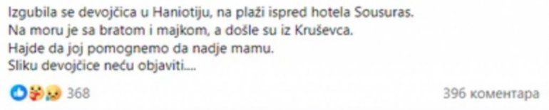 Jedan turista je na grupi podelio informaciju da se devojčica iz Kruševca izgubila u Haniotiju, na plaži ispred hotela "Sousuras".