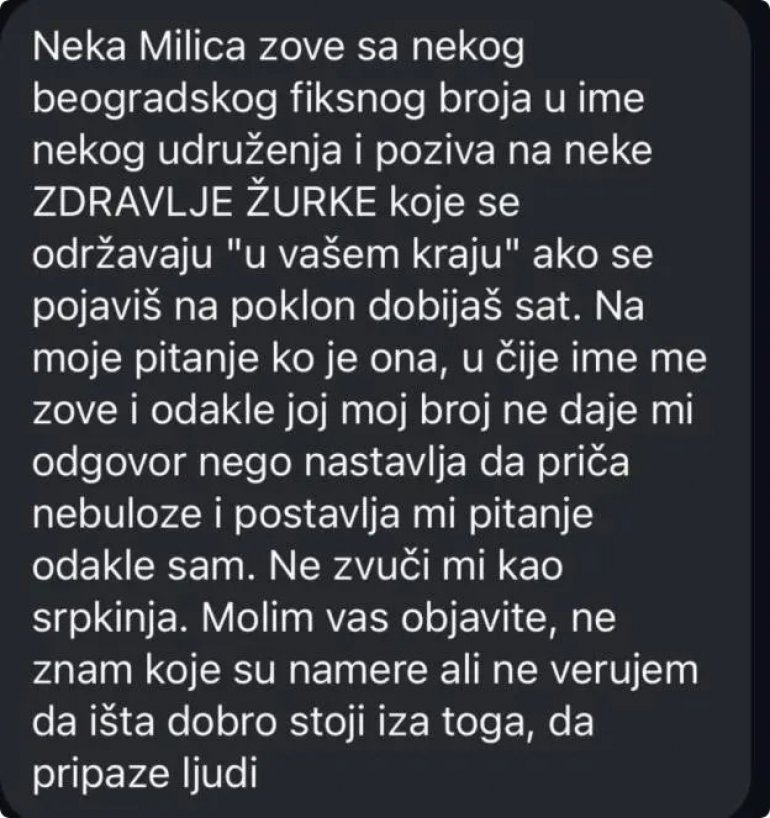 - Neka Milica zove sa nekog beogradskog fiksnog broja u ime nekog udruženja i poziva na neke zdravlje žurke koje se održavaju u vašem kraju ako se pojaviš na poklon dobiješ sat. Na moje pitanje ko je ona, u čije ime me zove i odakle joj moj broj, ne daje mi odgovor nego nastavlja da priča nebuloze i postavlja mi pitanje odakle sam - navodi se u upozorenju koje je objavljeno na storiju Instagram stranice "Serbialive Beograd".