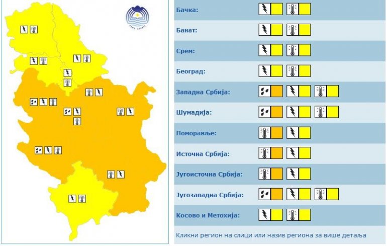 Narandžasti meteoalarm zbog pljuskova biće na snazi u Zapadnoj Srbiji, Šumadiji i Jugozapadnoj Srbiji. U svim delovima Srbije na snazi je žuti alarm zbog grmljavine.