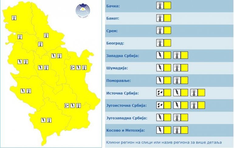 U sredu će situacija sa meteoalarmom biti slična. Prema prognozi RHMZ-a, žuti meteoalarm za kišu na snazi je u Istočnoj i Jugoistočnoj Srbiji, dok je u celoj zemlji na snazi žuto upozorenje zbog visokih temperatura.