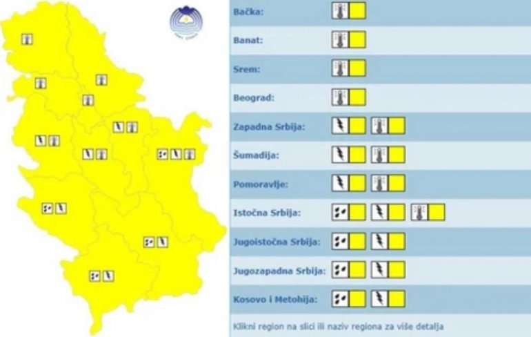 Na teritoriji cele Srbije na snazi je žuti meteoalarm zbog najavljenih vrućina, ali nepogoda i to na zapadu, istoku, jugoistoku, jugozapadu, u Pomoravlju, Šumadiji i na Kosovu i Metohiji.