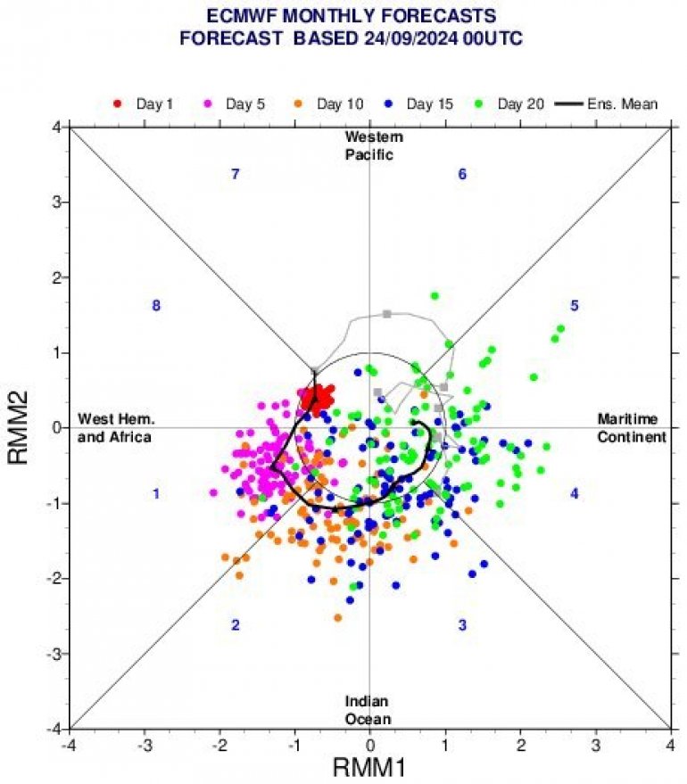 Kaže da MJO indeks ulaskom u fazu 2 početkom oktobra kao i srednjoročni ECMWF model ukazuju na hladniji period u drugoj polovini oktobra i početkom novembra.