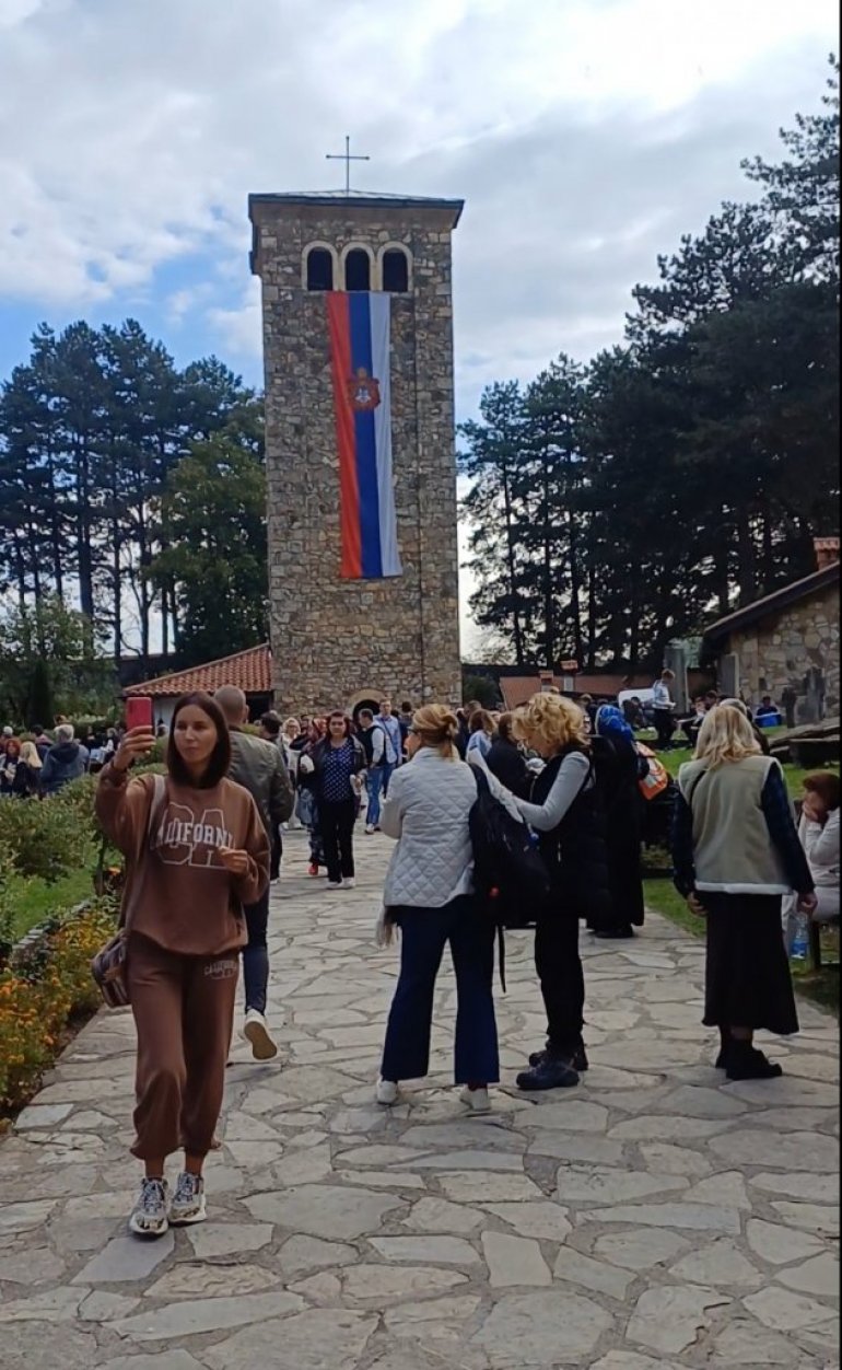 Kraj njega su se vernici i juče okupljali, da i njega ovekoveče i foto-aparatima i srcem kao i pred centralnim hramom unutar kojeg su i crkve Svetih apostola, Bogorodičina, kao i crkve Svetog Dimitrija i Svetog Nikole. I sve je bilo uzvišeno, s verom, sa željom za povratak gradu i svetinji na Pećkoj Bistrici.