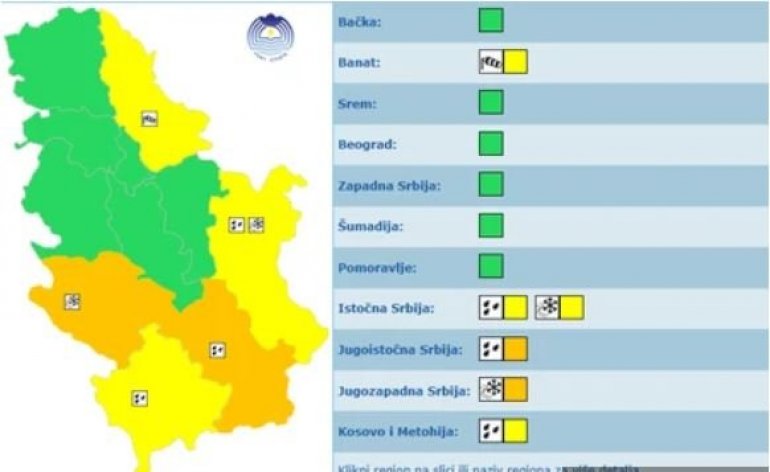 Večeras i u toku noći u oblastima od jugozapadne Srbije, preko Rasinskog i Topličkog okruga do istočne i jugoistočne Srbije mestimično se očekuju obilnije padavine: u nižim predelima jaka kiša, a u brdsko-planinskim oblastima sneg uz brzo povećanje visine snežnog pokrivača za 10 do 20 centimetra, lokalno i više.
