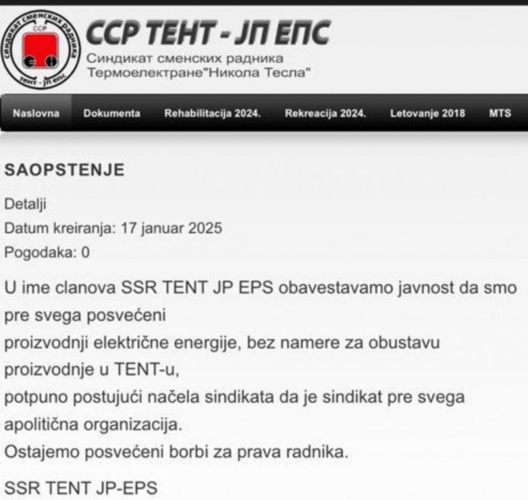 SINDIKAT TENT-a obaveštava javnost da ostaju posvećeni proizvodnji električne energije i da neće biti obustavljanja proizvodnje.