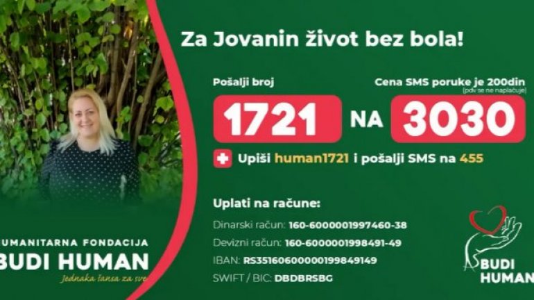 Za život bez bola, Jovani možemo pomoći u okviru Fondacije "Budi human" slanjem poruke 1721 na broj 3030 ili uplatom na dinarski ili devizni račun.