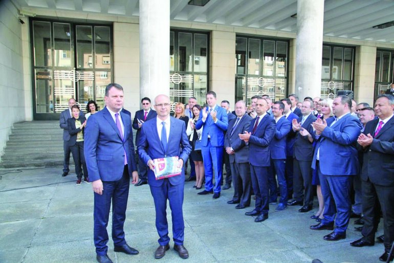 NA POSLEDNjOJ SEDNICI uoči izbora, reč datu koalicionim partnerima i opoziciji da će svojim glasovima dati „zeleno svetlo“ grbu i barjaku predaka koji su stolećima u Austrougarskoj sanjali san o jedinstvu sa maticom, poslanici DS povukli su uz obrazloženje da su se u međuvremenu setili kako nije bilo javne rasprave o tim simbolima.Usvojeni su i istaknuti 2016. godine kada je na čelo Pokrajinske vlade došao Igor Mirović.