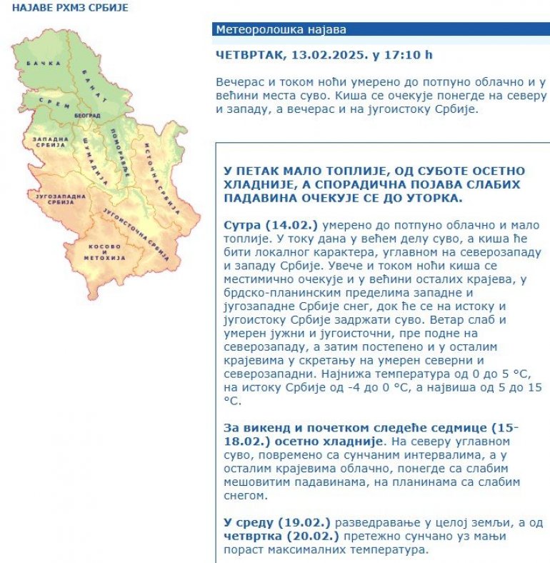 Sutra (14.02.) umereno do potpuno oblačno i malo toplije. U toku dana u većem delu suvo, a kiša će biti lokalnog karaktera, uglavnom na severozapadu i zapadu Srbije. Uveče i tokom noći kiša se mestimično očekuje i u većini ostalih krajeva, u brdsko-planinskim predelima zapadne i jugozapadne Srbije sneg, dok će se na istoku i jugoistoku Srbije zadržati suvo. Vetar slab i umeren južni i jugoistočni, pre podne na severozapadu, a zatim postepeno i u ostalim krajevima u skretanju na umeren severni i severozapadni. Najniža temperatura od 0 do 5 °S, na istoku Srbije od -4 do 0 °S, a najviša od 5 do 15 °S.