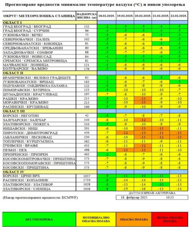 - Prognozirane vrednosti minimalne dnevne temperature vazduha biće u kategoriji opasne pojave 19. do 22. februara u pirotskom i jablaničom okrugu, kao od 19. do 20. februara u pećkom i nišavskom okrugu, a 20. februara na teritoriji raškog, moravičkog, zaječarskog i pčinjskog okruga. Prognozirane vrednosti u domeni potencijalno opasne pojave biće u većem delu Srbije - navedeno je u saopštenju.