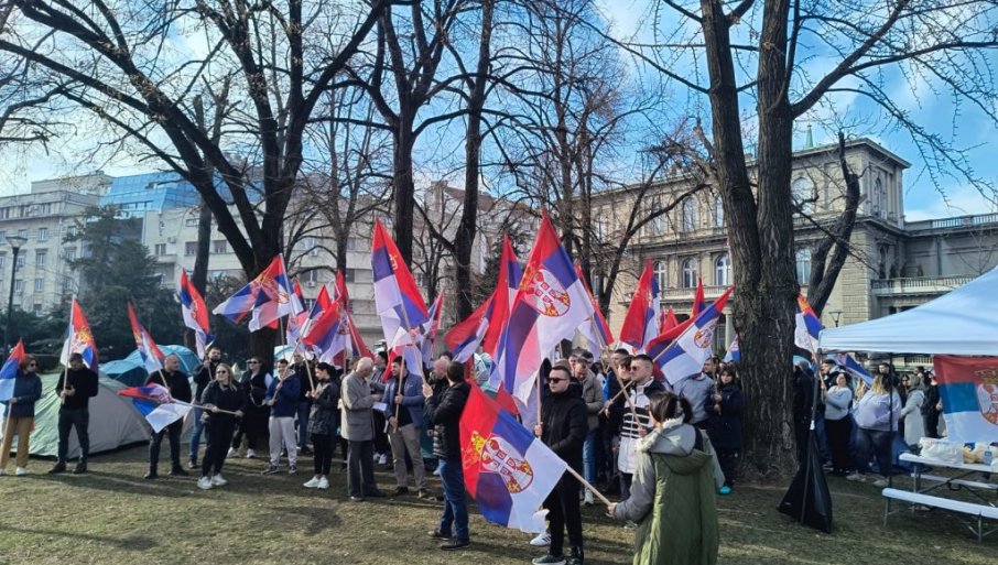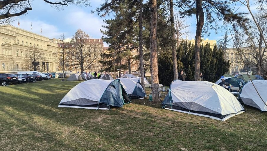 STUDENTI koji žele da studiraju proveli su noć u šatorima u Pionirskom parku, gde je upravo intonirana himna Bože pravde.