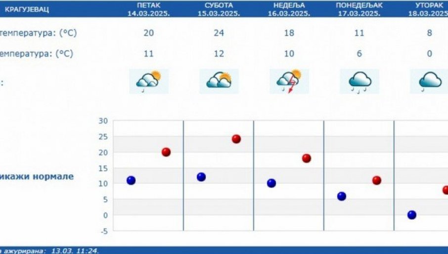 Prema izgledima vremena za narednih sedam dana, do petka, 21. marta, u subotu promenljivo oblačno i natprosečno toplo sa temperaturama od 18 na severozapadu do 26 stepeni na jugoistoku zemlje, mestimično sa kišom i pljuskovima sa grmljavinom, pre podne u Vojvodini, posle podne u zapadnim, a do kraja dana i u ostalim krajevima Srbije.