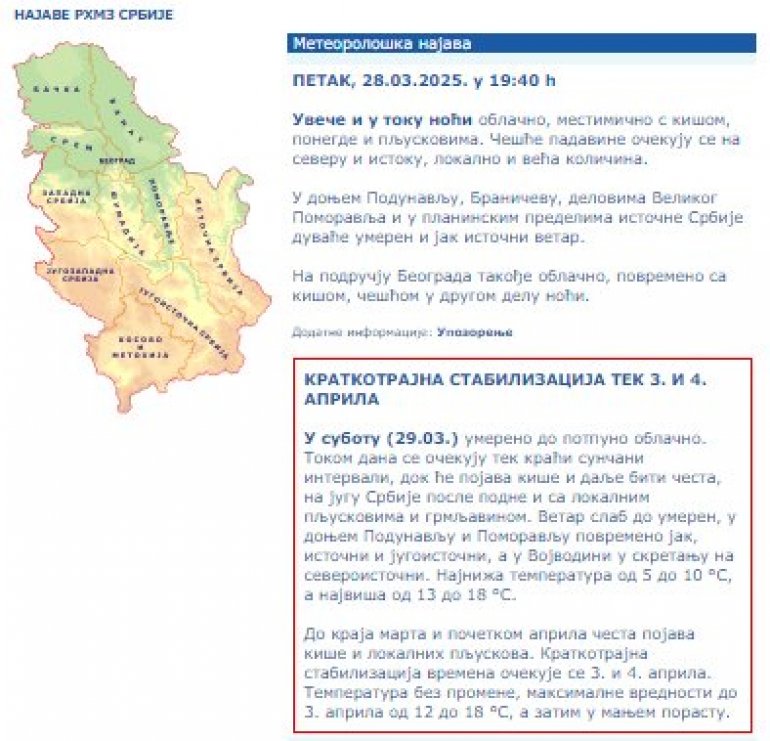 Do kraja marta i početkom aprila česta pojava kiše i lokalnih pljuskova. Kratkotrajna stabilizacija vremena očekuje se 3. i 4. aprila. Temperatura bez promene, maksimalne vrednosti do 3. aprila od 12 do 18 °S, a zatim u manjem porastu. - stoji na sajtu RHMZ.