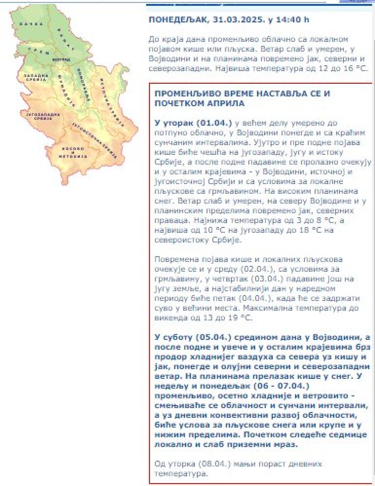 U subotu (05.04.) sredinom dana u Vojvodini, a posle podne i uveče i u ostalim krajevima brz prodor hladnijeg vazduha sa severa uz kišu i jak, ponegde i olujni severni i severozapadni vetar. Na planinama prelazak kiše u sneg. U nedelju i ponedeljak (06 - 07.04.) promenljivo, osetno hladnije i vetrovito - smenjivaće se oblačnost i sunčani intervali, a uz dnevni konvektivni razvoj oblačnosti, biće uslova za pljuskove snega ili krupe i u nižim predelima. Početkom sledeće sedmice lokalno i slab prizemni mraz - stoji na sajtu RHMZ.