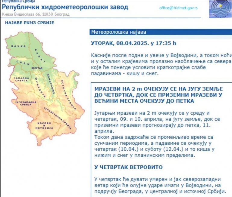Jutarnji mrazevi na 2 metra očekuju se u sredu i četvrtak, 09. i 10. aprila, na jugu zemlje, dok se prizemni mrazevi prognoziraju do petka, 11. aprila, saopštio je RHMZ.
