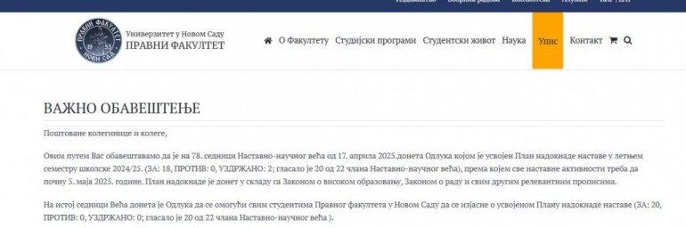 "Ovim putem Vas obaveštavamo da je na 78. sednici Nastavno-naučnog veća od 17. aprila 2025.doneta Odluka kojom je usvojen Plan nadoknade nastave u letnjem semestru školske 2024/25. (ZA: 18, PROTIV: 0, UZDRŽANO: 2; glasalo je 20 od 22 člana Nastavno-naučnog veća), prema kojem sve nastavne aktivnosti treba da počnu 5. maja 2025. godine. Plan nadoknade je donet u skladu sa Zakonom o visokom obrazovanju, Zakonom o radu i svim drugim relevantnim propisima", navedeno je u saopštenju fakulteta.
