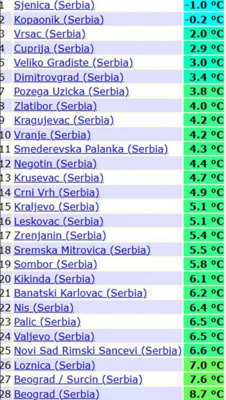 Da podsetimo, današnje jutro bilo je veoma hladni,u Sjenici i na Kopaniku je zabeležen mraz od -1°C, a u gradovima se temperatura ponegde spustila i na samo 2°C.