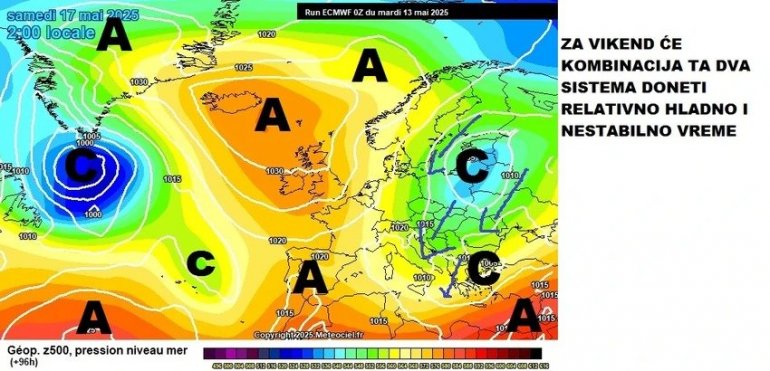 Ristić najavljuje od petka, 16. maja ponovo hladnije, sa maksimalnom temperaturom od 16 do 21 stepen uz smenu sunca i oblaka koji će donositi povremeno kišu. Više kiše tokom predstojećeg vikenda zbog razvoja ciklona u Jonskom moru biće na jugu Srbije.