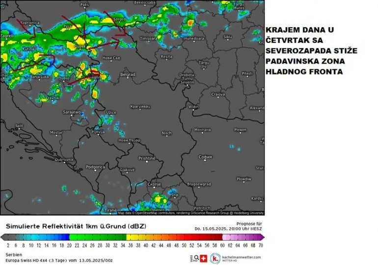 - U četvrtak predveče na severozapadu regiona uslediće naoblačenje sa kišom i pljuskovima koje će se u toku noći premešati dalje na jugoistok, gde će u isto vreme stizati padavinska zona preko Mediterana. Ova dva sistema će se u noći ka petku spojiti na jugostoku regiona te se u petak nad jugoistokom Srbije i veći delom Crne Gore kao i nad južnim Jadranom očekuju česta pojava kiše i grmljavinskih pljuskova, dok bi na najvišim planinama bilo uslova i za vlažan sneg – objašnjava Marko Čubrilo.