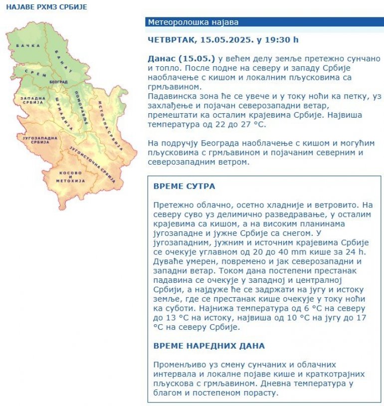 - Danas (15.05.) u većem delu zemlje pretežno sunčano i toplo. Posle podne na severu i zapadu Srbije naoblačenje s kišom i lokalnim pljuskovima sa grmljavinom.