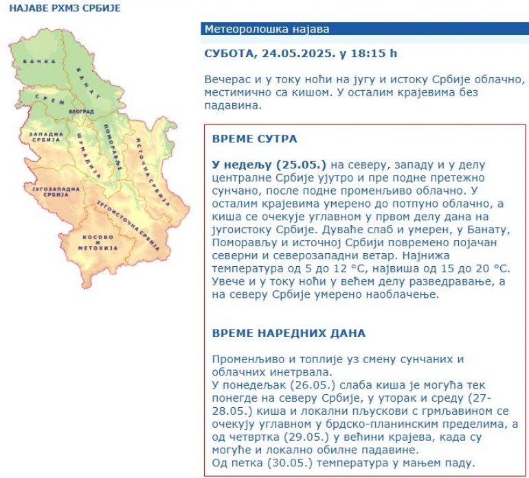 U nedelju (25.05.) na severu, zapadu i u delu centralne Srbije ujutro i pre podne pretežno sunčano, posle podne promenljivo oblačno. U ostalim krajevima umereno do potpuno oblačno, a kiša se očekuje uglavnom u prvom delu dana na jugoistoku Srbije. Duvaće slab i umeren, u Banatu, Pomoravlju i istočnoj Srbiji povremeno pojačan severni i severozapadni vetar. Najniža temperatura od 5 do 12 °S, najviša od 15 do 20 °S. Uveče i u toku noći u većem delu razvedravanje, a na severu Srbije umereno naoblačenje.