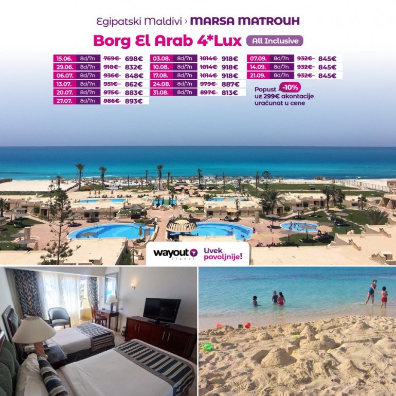 Ovaj raskošni hotel sa 4* poseduje veliku baštensku terasu sa bazenom kao i wellness centar sa punom uslugom. Sa slikovitim pejzažima belih plaža i kristalno čistim morem idealno je mesto za opuštanje usled očaravajuće lepote netaknute obale. Borg El Arab se nalazi na 45 minuta vožnje od Aleksandrije.