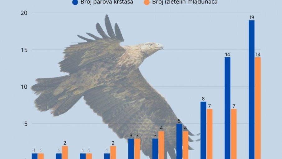 OD ruba nestanka do nove nade: tako u najkraćem glasi raport ornitologa Društva za zaštitu i proučavanje ptica Srbije, koji su u najuspešnijoj gnezdućoj sezoni od 2017. godine, kada se počelo sa intenzivnim radom na oporavku orlova krstaša, ove godine zabeležili 19 parova, od kojih se 10 uspešno gnezdilo i odnegovalo 14 mladunaca. Dva mlada krstaša nedavno su prstenovana i obeležena uređajima za satelisto praćenje.