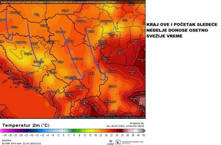 - Prema trenutnim izgledima u subotu poslepodne, u noći ka nedelji i u nedelju uz promenljivu oblačnost mestimično može biti prolazne kiše i pljuskova s grmljavinom, ponegde-prolazno i umerenog do jakog vetra. U subotu malo svežije na severu i zapadu zemlje, u ostalim krajevima i dalje vruće, na istoku i jugu ponegde moguće i do 40-42 stepeni, dok je u nedelju osveženje moguće u svim predelima - najavio je "Vreme&Radar".