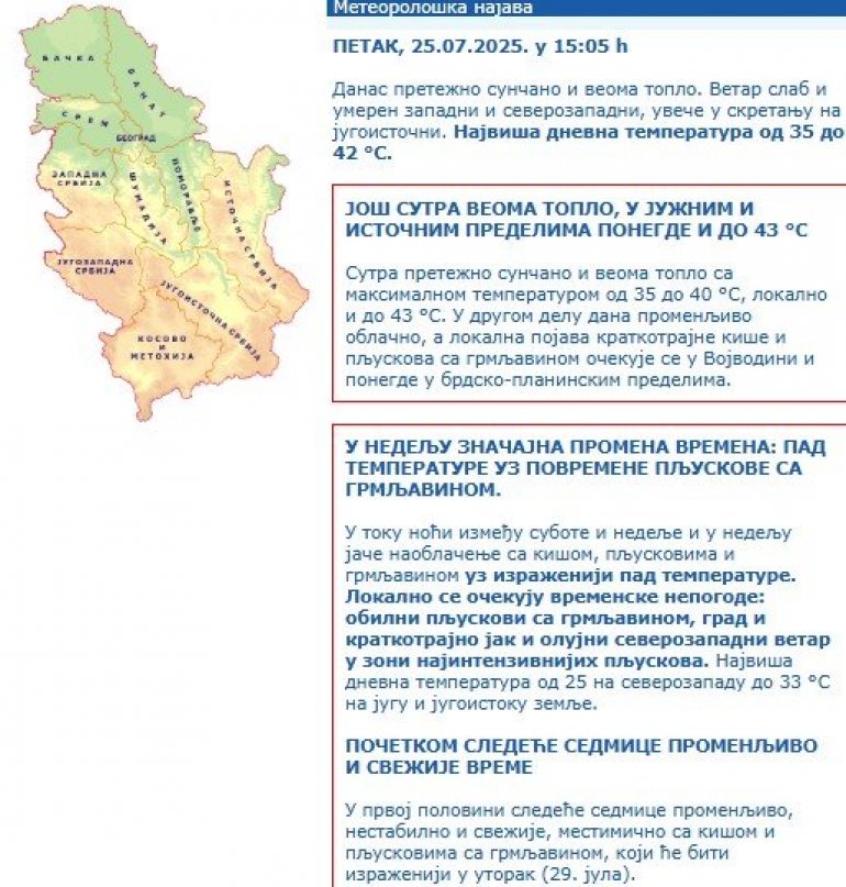 Sutra pretežno sunčano i veoma toplo sa maksimalnom temperaturom od 35 do 40 °S, lokalno i do 43 °S. U drugom delu dana promenljivo oblačno, a lokalna pojava kratkotrajne kiše i pljuskova sa grmljavinom očekuje se u Vojvodini i ponegde u brdsko-planinskim predelima.