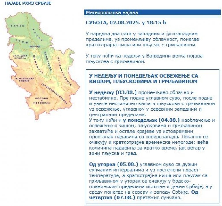 Od utorka (05.08.) uglavnom suvo sa dužim sunčanim intervalima i uz postepeni porast temperature, a kratkotrajna kiša ili pljusak sa grmljavinom u utorak se očekuju u brdsko-planinskim predelima istočne i južne Srbije, a u sredu ponegde na severu i zapadu Srbije. Od četvrtka (07.08.) pretežno sunčano. - stoji na sajtu RHMZ.