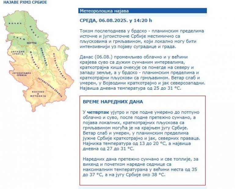 Danas (06.08.) promenljivo oblačno i u većini krajeva suvo sa dužim sunčanim intervalima, kratkotrajna kiša očekuje se ponegde na severu i zapadu zemlje, a u brdsko - planinskim predelima i kratkotrajni pljuskovi sa grmljavinom. Vetar slab i umeren, u Vojvodini kratkotrajno i jak severozapadni. Najviša dnevna temperatura od 25 do 31 °S. - stoji na sajtu RHMZ.