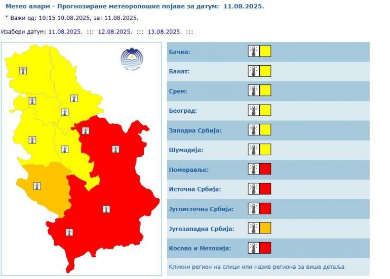U SRBIJI je danas na snazi crveni meteo alarm, koji upozorava na ekstremno visoke temperature, u regionu istočne i jugoistočne Srbije, kao i u Pomoravlju i AP Kosovo i Metohija, saopštio je Republički hidrometeorološki zavod (RHMZ).