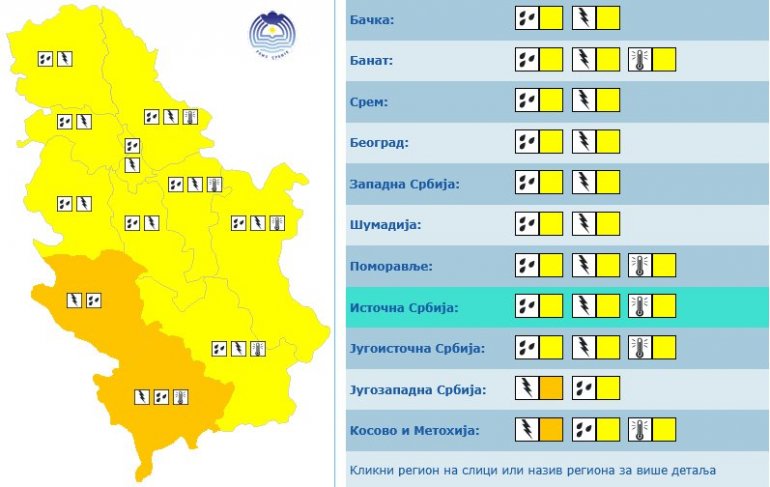 Građanima se savetuje oprez, naročito u zonama pljuskova i mogućih nepogoda