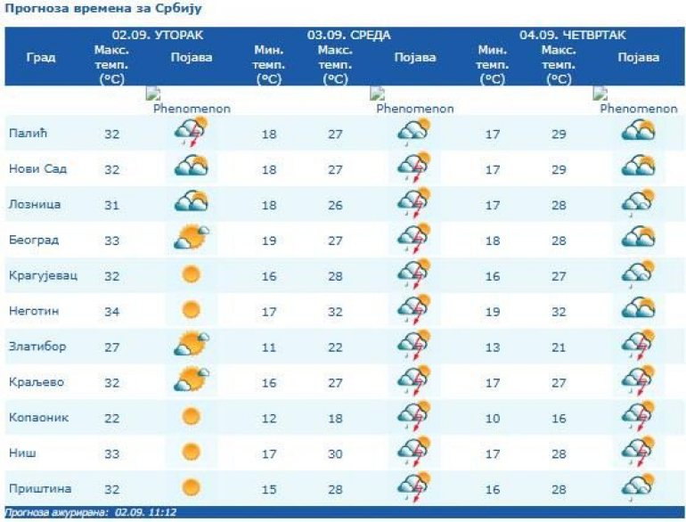 U četvrtak će biti promenljivo oblačno, ujutru na jugoistoku i istoku mestimično sa kišom i kratkotrajnim pljuskovima, a tokom dana i u brdsko-planinskim predelima i to posebno jugozapadne i zapadne Srbije. Vetar slab promenljiv. Najniža temperatura od 14 do 19 stepeni, a najviša od 25 do 29, u Negotinskoj Krajini oko 32 stepena.