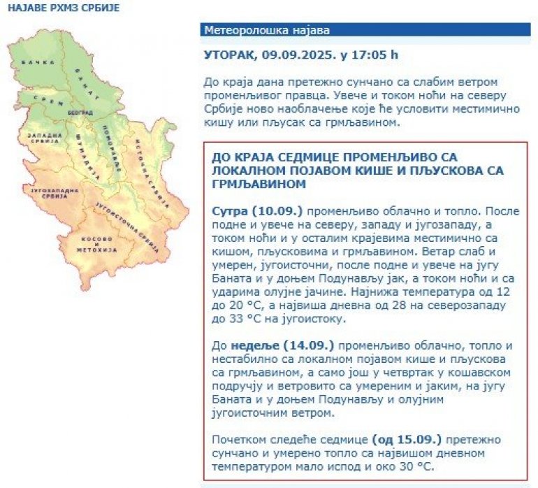 Do nedelje (14.09.) promenljivo oblačno, toplo i nestabilno sa lokalnom pojavom kiše i pljuskova sa grmljavinom, a samo još u četvrtak u košavskom području i vetrovito sa umerenim i jakim, na jugu Banata i u donjem Podunavlju i olujnim jugoistočnim vetrom.