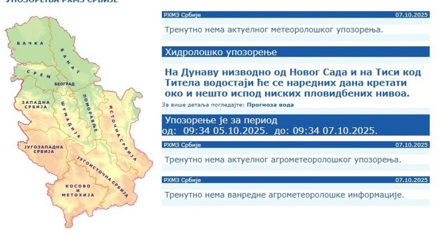 U istočnoj i jugoistočnoj Srbiji danas je na snazi žuti meteo alarm zbog kiše. Ovo upozorenje znači da vreme može biti potencijalno opasno: Vremenske pojave koje su prognozirane nisu neuobičajene, ali je potreban oprez ako planirate aktivnosti koje su izložene meteorološkom riziku. Treba nastaviti sa informisanjem o očekivanim meteorološkim uslovima. Ne preduzimajte nepotrebne rizike.