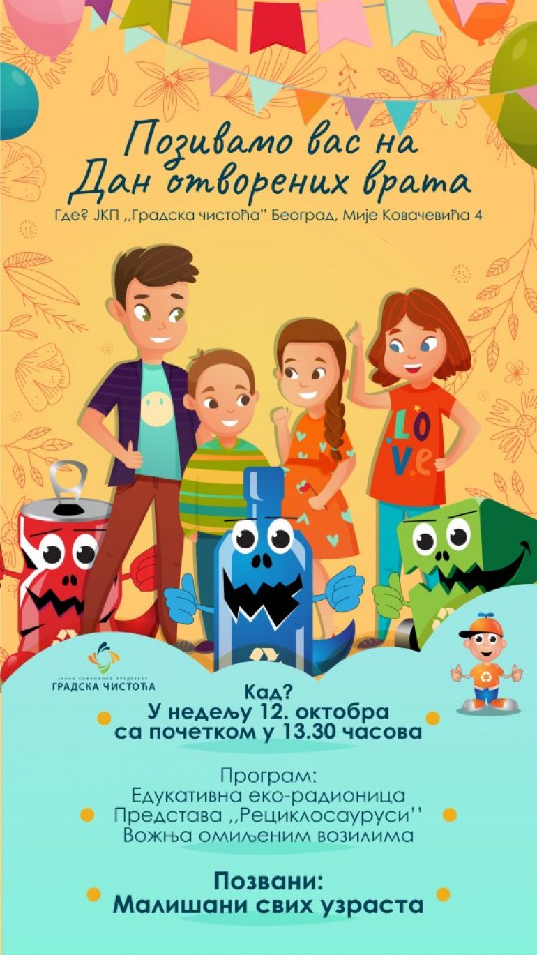 Tokom tradicionalne akcije „Dan otvorenih vrata“ mališani će u pratnji svojih roditelja, staratelja, baka i deka, vaspitača i nastavnika moći da iskoriste jedinstvenu priliku da pored vožnje u omiljenim smećarcima vide i kako izgleda vožnja u specijalizovanim vozilima, za vodu i zemlju, popularnim Amfibijama, kako se koriste elektro-čistilice, elektro-trotineti, duvači za lišće, elektro-usisivači, kao i da učestvuju u edukativnim radionicama o reciklaži, a sve to u obezbeđenom krugu preduzeća.