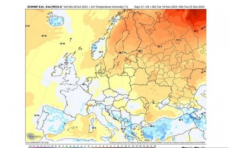 Srednjemesečna prognoza za Evropu pokazuje da će toplija vazdušna masa nastaviti da se kreće iznad severa i severoistoka. Ali iznenađujuće, vidi se trend prelaska sa normalnog na hladniji u centralnim, zapadnim i severozapadnim delovima.