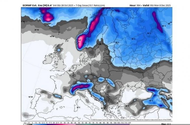- Takođe imamo produženu prognozu snežnih padavina za prvu nedelju meteorološke zime širom Evrope, glavne zone za snežne padavine su uglavnom povezane sa višim nadmorskim visinama u centralnim delovima, što se očekuje pod toplijom nego običnom vazdušnom masom. Prognozira se da će snežna pokrivenost sezonski početi da se povećava iznad severnih i severoistočnih delova. Pažljivo ćemo pratiti razvoj događaja, posebno zato što stratosferske prognoze za početak decembra pokazuju neobično usporavanje/slabljenje Polarnog vrtloga-objavljeno je na sajtu.