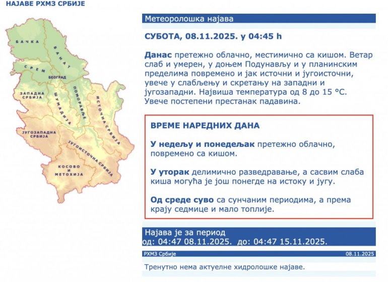 Danas pretežno oblačno, mestimično sa kišom. Vetar slab i umeren, u donjem Podunavlju i u planinskim predelima povremeno i jak istočni i jugoistočni, uveče u slabljenju i skretanju na zapadni i jugozapadni. Najviša temperatura od 8 do 15 °S.