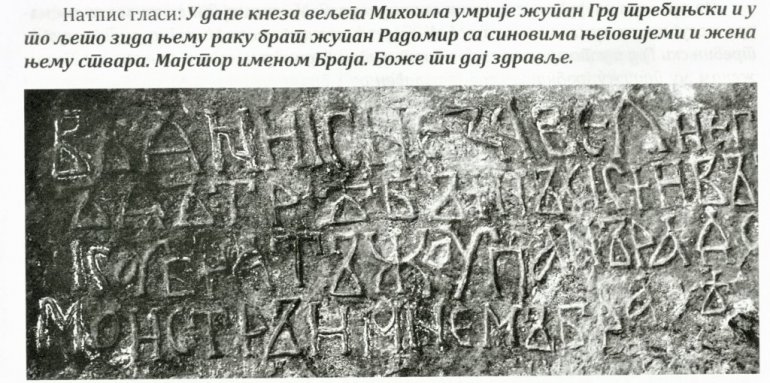 Komar daje pravu transliteraciju natpisa na mramoru: "U ime otca i sina i svetago duha sie (ovde) leži raba Božia Polihranija. A zovom (imenom) mirskim gospoža Radača župana Nenaca Čihorića... A postavi s (ovaj) beleg nje (njoj) sin Dabiživ s Božjom pomošćju sam sa svoim ljudimi. A v dni gospodina kralja Tvrtka."
