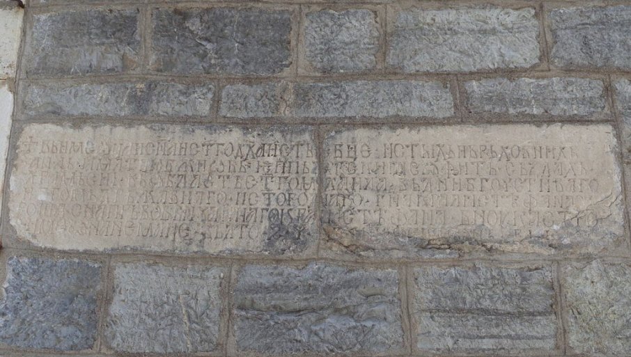 - Ćirilični natpis zetskog episkopa Neofita za Crkvu svetog Petra i Pavla je načinjen na dva bloka žutoga peščara, a danas je postavljen u pročelju južno od vrata. Natpis je najprije postavljen iznad vrata, a prilikom obnove crkve 1925. pomjeren je na sadašnje mjesto - piše dr Komar. - Natpis je objvila G. Tomović, a prije nje njime su se zanimali mnogi istraživači. Obično se po Istoriji Crne Gore tvrdi da su benediktinci posjedovali Miholjsku prevlaku do sredine 13. vijeka, a tada bi se, najednom pojavio Zetski episkop Neofit. Ovakva tvrdnja isključuje mogućnost zasnivanja sjedišta Zetske episkopije od strane Svetog Save Srpskog i za njom se povode gotovo svi istoričari... Ceo natpis glasi: "U ime oca i Sina i Svetoga duha i Svete Bogorodice i Svetih Apostola i milošću Božijom ja Episkop zetski Neofit sagradih hram ovaj u Oblasti Svetoga Mihaila u doba Bogočastivog i Bogom državnog i svetorodnog gospodina kralja Stefana Uroša sina prvovenčanog kralja Stefana, unuka Svetog Simeona Nemanje u leto 6777, indikta 12."