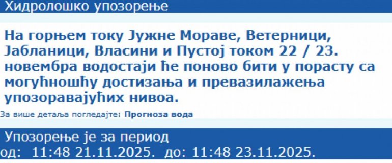 - Na gornjem toku Južne Morave, Veternici, Jablanici, Vlasini i Pustoj tokom 22 i 23. novembra vodostaji će ponovo biti u porastu sa mogućnošću dostizanja i prevazilaženja upozoravajućih nivoa - upozorava RHMZ.